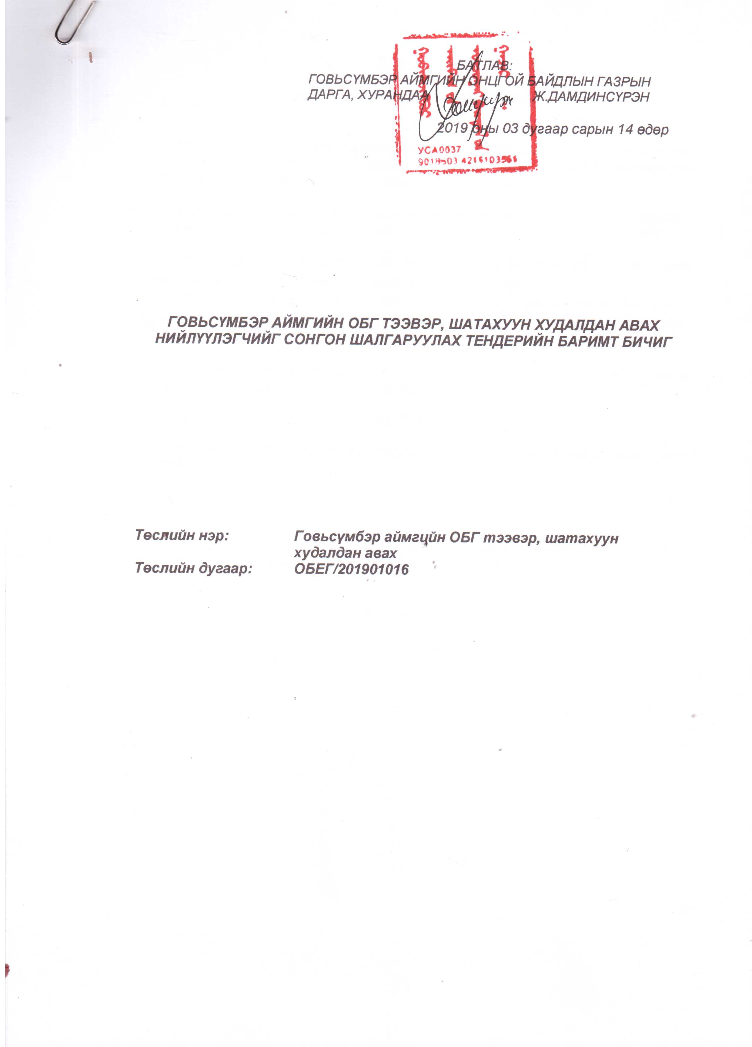 ОНЦГОЙ БАЙДЛЫН ЕРӨНХИЙ ГАЗРЫН ДАРГЫН ТУШААЛ